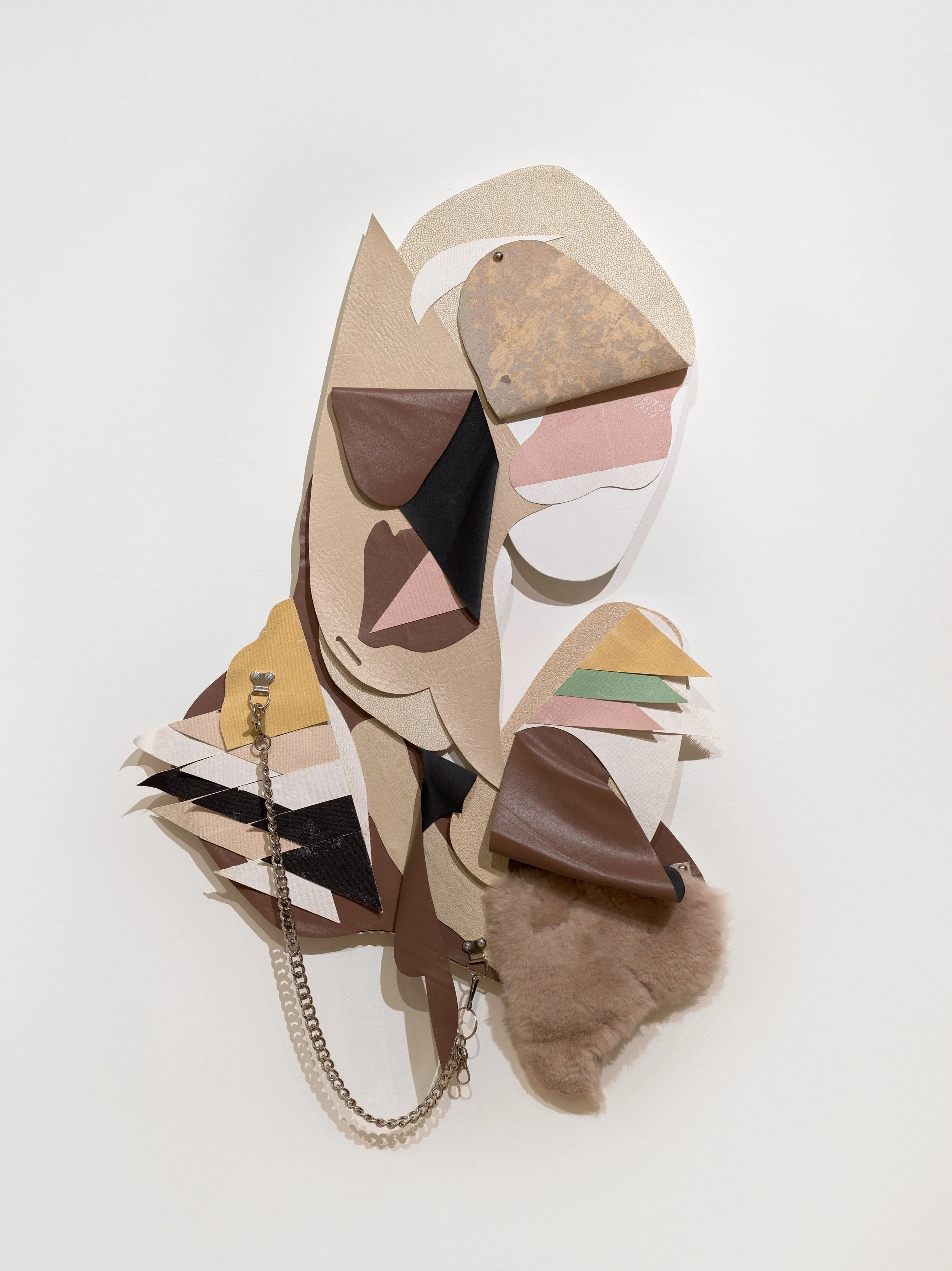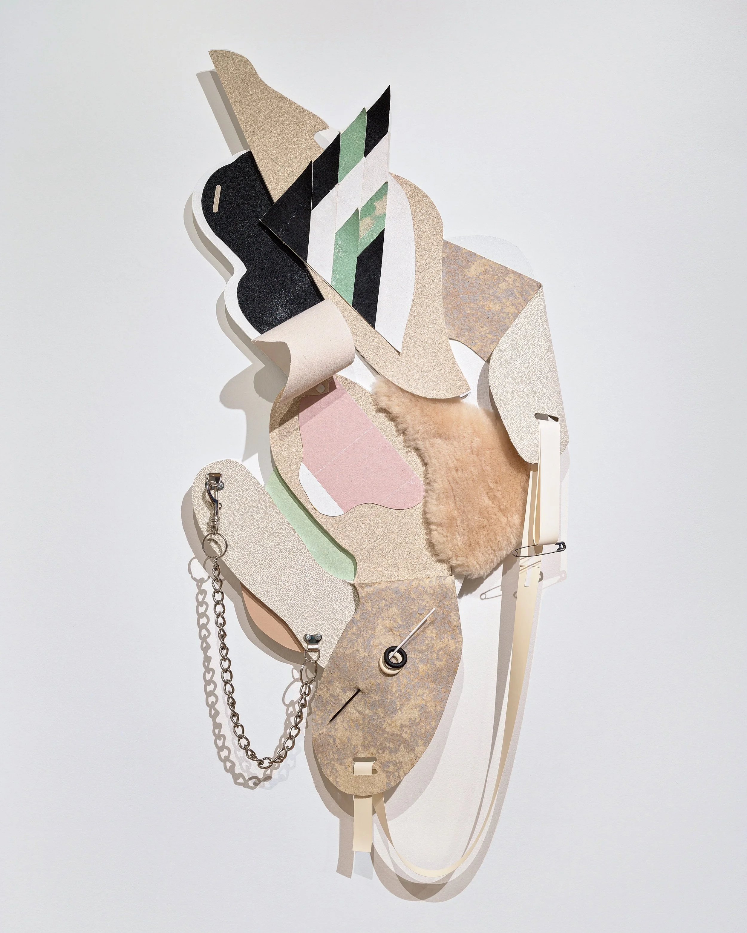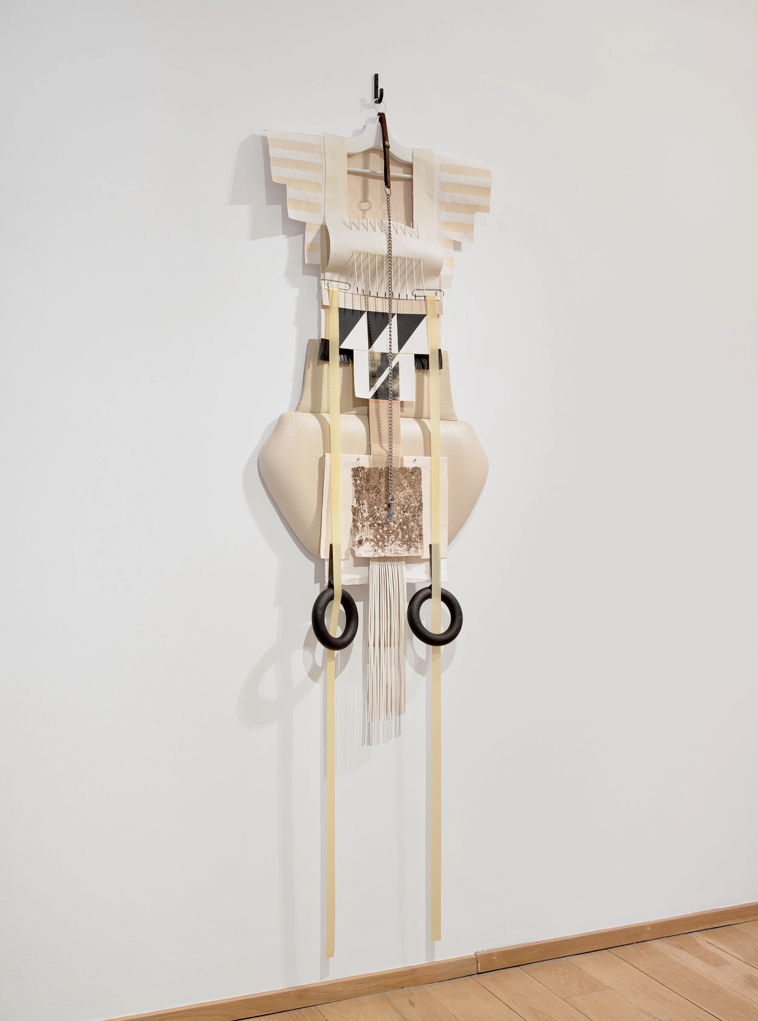 Ritual Assimilation (2021/22).Plywood, Canvas, Vinyl Trim, Paint, Rubber, Polystyrene, Dog Collar, Accreted Latex, Pins, Coathanger